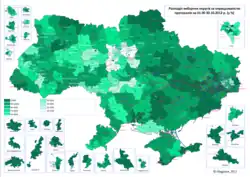 In June 2011 the Venice Commission reviewed a proposed Draft Law on the election of Ukrainian parliamentary members.[45] The proposal sought to re-instate a parallel voting system – used in the 1998 and 2002 elections[46] – with the establishment of 225 local single-member districts elected (in one round)[47] by a first-past-the-post electoral system (candidate with the highest vote total wins); and the remaining 225 parliamentary seats being elected nationwide on a proportional party-list system[45] with a 5% support threshold; and excluding political blocs from all elections.[48] The option "Vote against all" was also made defunct in the proposal[48][49] (according to a November 2012 opinion poll by Research & Branding Group (otherwise) 17% of the voters would have voted "against everybody" during the elections).[50] The opposition and Ukrainian analysts accused the Party of Regions of "rewriting the law so that the president could secure a majority in the next Verkhovna Rada."[49][51] In October 2011 the Venice Commission recommended Ukraine should not return to a mixed election system.[52] Nevertheless, on 17 November 2011 the Ukrainian Parliament approved an election law almost identical to the June 2011 proposed Draft Law.[10][11] This new law satisfied the major opposition parties Batkivschyna and Front for Change; but was condemned by the core party of Our Ukraine–People's Self-Defense Bloc, Our Ukraine.[53][54][55] Candidates could be elected on party lists or through self-nomination.[10] On 8 December 2011 President Viktor Yanukovych signed the new election law.[56] Since then several parties merged with other parties.[57][58][59]