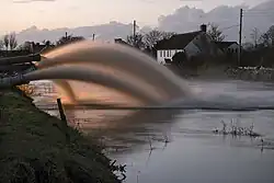 For two days in February, the River Ash flooded at least 80 homes, their grounds, garages and/or outbuildings in Staines-upon-Thames. Slow flow into the swollen Thames created flooding pinchpoints of two Colne distributaries into the Staines Aqueduct owned by Thames Water which briefly burst its banks. The latter said it had been following an existing three-party protocol. The EA replaced its inadequate sluice quickly.[31] The Council's resultant section 19 Report was published on 20 April 2015. It states "the primary source of flooding that contributed to this flooding incident was fluvial in nature; the Environment Agency is the lead on managing fluvial flood risk...The EA owns and operates a sluice gate which controls flow from River Colne to the River Ash. This...is designed to ensure there is always a base flow in the River Ash to maintain the ecosystem of the river.[30] This sluice gate adjusts automatically to send flow into the River Ash as needed. In the February event the EA overrode the automatic settings on this gate to control flooding.[30] On 9 February (morning), EA reported that the Hythe End intake gates to the Aqueduct were fully closed. And that from this point, the Aqueduct was being fed solely with floodwater originating from the County Ditch and Wraysbury River. Thames Water increased the pumping rate from 270 million litres-a-day to 350 million litres-a-day from its Birch Green pumping station in an attempt to control flood levels. On 9 February, according to the EA, they asked Thames Water to close the Moor Lane sluice gate, which is located on the Aqueduct. Thames Water claimed to have no record of receiving that request and as a consequence, the gate was not closed... ...the Aqueduct had partially collapsed while causing significant damage.[30] LLFA Surrey County Council had no direct flood risk management functions during the event.[32] [M]odelling work due...by the EA...will inform more robust water management measures in the future.[32]