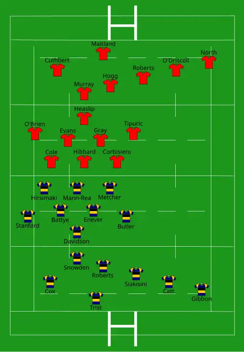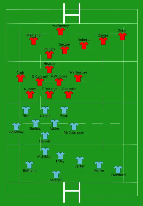 | Try: Carter (2) 13' c, 45' c Con: McKibbin (2/2) 15', 46' Pen: McKibbin (1/1) 33' | Report | Try: Sexton 5' c Halfpenny (2) 39' c, 43' c Croft 54' c Davies 71' c Con: Halfpenny (4/4) 7', 40', 44', 54' Farrell (1/1) 72' Pen: Halfpenny (4/4) 3', 18', 26', 51' |