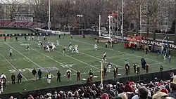 The 2013 Fordham Rams football team represented Fordham University as a member of the Patriot League during the 2013 NCAA Division I FCS football season. Led by second-year head coach Joe Moorhead, the Rams compiled an overall record of 12–2. Fordham was not eligible for the Patriot League championship because the program used scholarship players while the rest of the league's members did not. The team's official conference record was 0–0.[1] Though ineligible for the conference title, Fordham finished the regular season at 11–1 and earned an at-large bid to the NCAA Division I Football Championship playoffs, where the Rams defeated Sacred Heart in the first round before losing to Towson in the second round. Fordham finished the season ranked ninth in the Sports Network Poll, the highest final ranking for the program at the NCAA Division I Football Championship Subdivision (FCS) level. The team played home games at Coffey Field in The Bronx.