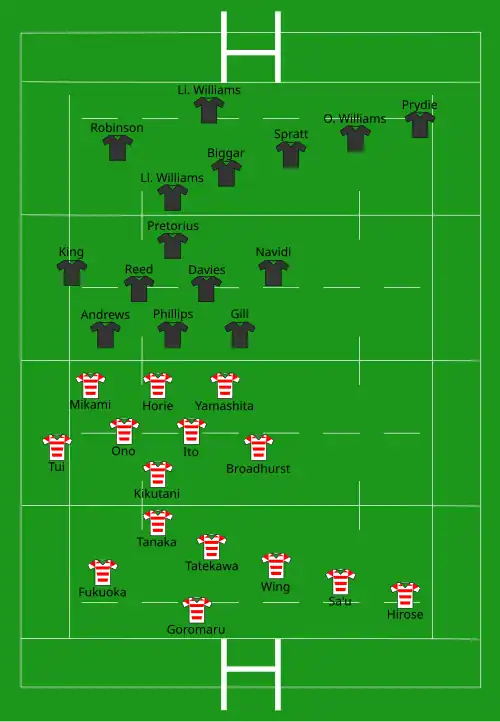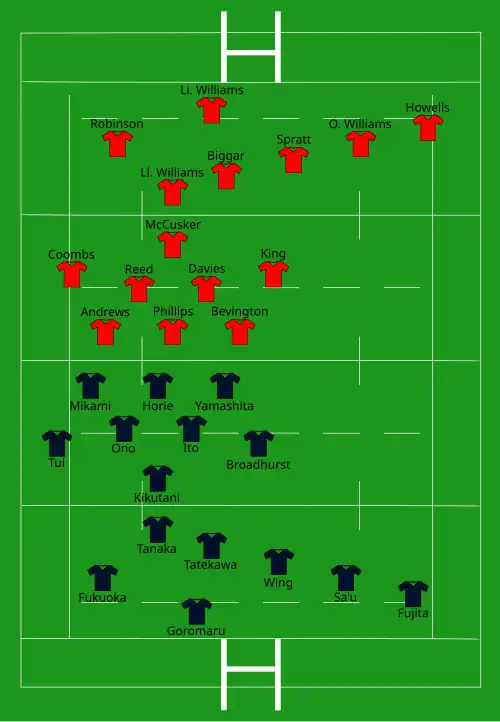 | Try: Broadhurst 38' m Fujita 69' c Con: Goromaru (1/2) 70' Pen: Goromaru (2/4) 15', 20' | Report[5] | Try: Robinson 63' c Con: Biggar (1/1) 64' Pen: Biggar (4/5) 23', 29', 46', 59' Patchell (1/1) 79' |