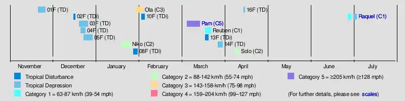 | Pam | March 6–15 | Category 5 severe tropical cyclone | 250 km/h (155 mph) | 896 hPa (26.46 inHg) | Fiji, Kiribati, Solomon Islands, Tuvalu, Vanuatu, New Caledonia, New Zealand | $692 million | 15 | |