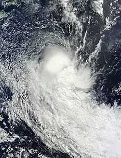 The FMS estimated Pam as having record-breaking 250 km/h (155 mph) ten-minute sustained winds.[22] The storm's winds gradually slowed afterwards as Pam tracked west of Tafea. However, the FMS indicated that the cyclone's pressure dropped further to a minimum of 896 mbar (hPa; 26.46 inHg) on March 14.[23] Pam left the FMS area of responsibility as it progressed along its path, the storm's eye faded away and Pam's low level circulation became displaced from its associated thunderstorms, signalling a rapid weakening phase.[24] Later on March 15, both agencies discontinued issuing advisories as Pam entered a phase of extratropical transition while affecting northeastern New Zealand.