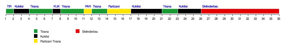 | 4 | Tirana | 36 | 21 | 8 | 7 | 47 | 27 | +20 | 71 | |