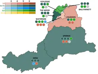 ![]() Derry and Strabane 2014 Council Election Results by DEA (Shaded by plurality of FPVs) | ||||||||||||||||||||||||||||||||||||||||||||||||||||||||||||||||||||||||||||||||||