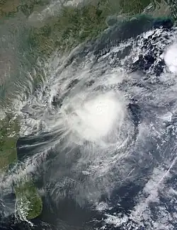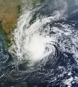 In late October, a low-pressure area formed over the Arabian Sea. It slowly consolidated and a Tropical Cyclone Formation Alert (TCFA) was issued by the Joint Typhoon Warning Center (JTWC) on October 24.[27] The following day, the India Meteorological Department (IMD) classified the storm as a depression, designating it ARB 02, and the JTWC estimated tropical storm winds at the storm's center, starting advisories for the system.[28] On October 26, the system remained stationary and intensified into a Deep Depression. Subsequently, the IMD reported the storm had intensified into a cyclonic storm, and named it Nilofar.[29][30] The following day, the IMD upgraded the storm into a severe cyclonic storm and further to a very severe cyclonic storm, and the JTWC reported hurricane-strength winds at Nilofar's center as it meanwhile developed an eye feature.[31][32][33] On October 28, Nilofar underwent rapid intensification throughout the day, reaching a peak strength of 950 mbar (28.05 inHg) with wind speeds exceeding 205 km/h (127 mph), tied with Hudhud. Over the following days, the storm recurved northeastwards and experienced high vertical wind shear, causing it to weaken rapidly into a minimal cyclonic storm on October 30. The low-level circulation center of the storm became exposed in the following hours and IMD downgraded the storm into a well-marked low-pressure area on October 31, issuing its final advisory for the system.
