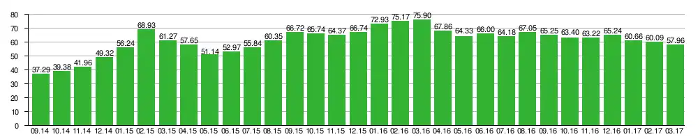 In August 2015, oil prices fell to US$37 per barrel and then bounced to more than US$45 on 28 August.[26] Now as OPEC has reduced production from November 2016 oil prices have started to move up and so does the rouble.