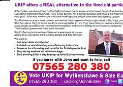 The UK Independence Party selected John Bickley, 60, a former Labour supporter[19] who grew up in Wythenshawe.[20] Bickley, who runs a mobile app firm, told The Guardian that he felt Parliament needed to "take responsibility" having "outsourced running of the country to the EU". Bickley added that he felt "Labour had let down the working class" and that Labour's behaviour would mean his former trade unionist father would be "turning in his grave".[21]