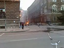 Dense smoke was caused by the burning of several police cars near the Building of the Presidency of Bosnia and Herzegovina, which was also heavily damaged when the demonstrators set fire to sections of the State Archives of Bosnia and Herzegovina, which is located there.[30][60] Demonstrators also torched and stoned the building of the Centar Municipality, Sarajevo, as well as the seat of the regional government of the Sarajevo Canton.[30]