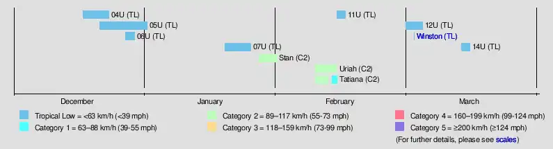 A low-pressure developed east of the 90th meridian east or the border of the basin on 26 December, and had a moderate chance of intensifying into a tropical cyclone.[35] TCWC Perth later classified it as a weak tropical low with the identifier of 06U.[36] On 28 December, as the low slowly moved south, unfavorable environments hinder the chance of being a cyclone.[37] TCWC Perth made its final bulletin of the tropical low as it slowly drifted west on 29 December.[38] During 19 January Tropical Low 07U developed within the monsoon trough of low pressure, about 300 km (185 mi) to the west of West Island in the Cocos (Keeling) Islands.[39] Over the next couple of days, the system moved north-eastwards and tried to develop further in a marginally conducive environment for further development.[40] However, the system weakened on 21 January, before it was last noted on 24 January, as it was not expected to develop into a tropical cyclone.[41][42] During 14 February a weak tropical low lied in an area of marginal conditions for further develop near Christmas Island.[43] Over the next couple of days, environmental conditions surrounding the system became less favorable for further development, before the system was last noted during 16 February.[43][44] During 26 February, Winston entered the basin as an extratropical cyclone, whilst the JTWC classified it as a subtropical cyclone;[45][46][47] ultimately, it made landfall over Queensland as a tropical low and quickly degenerated into a trough, on 3 March.[48][49][50][51]