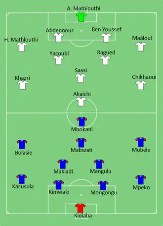 Tunisia took the lead in the 31st minute, as Yassine Chikhaoui's shot was deflected and Ahmed Akaïchi headed the ball in. DR Congo equalized in the 66th minute, after Dieumerci Mbokani headed down a long ball for Jeremy Bokila to score. The result was enough for Tunisia to win the group, while DR Congo also qualified as runners-up, ahead of Cape Verde on goals scored.[17][18]