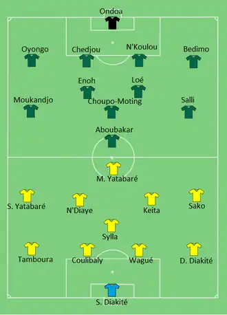 Mali took the lead in the 71st minute as Molla Wagué's flick-on from a free kick allowed Sambou Yatabaré to score at the far post. Cameroon equalized in the 84th minute, after Ambroise Oyongo controlled Raoul Loé's lofted pass to score from close range.[8][9]