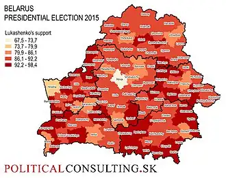 According to the Central Election Commission, more than 36% of voters used the early voting process, higher than in previous years.[24] Overall turnout was 87.22% – highest in Vitebsk Region at 91.08% and lowest in Minsk at 74.38%.[25][26] Alexander Lukashenko won the election with 83.47% of the vote.[25][27]