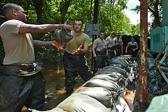The 2015 Louisiana flood took place in the United States for several weeks in June 2015.[1] The areas in Louisiana affected by the Red River flood included Caddo Parish, Bossier Parish, Natchitoches Parish, Rapides Parish, and the cities of Coushatta, Alexandria, and Shreveport.[2][3][4][5][6] The flood caused numerous road closures throughout Shreveport.[7] Response teams such as the Louisiana National Guard were deployed in order to fill and place sandbags at residences that were under flood warning.[8]