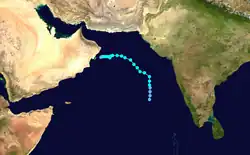Under the influence of an ongoing onset of a southwest monsoon, a low-pressure area formed on June 6. It slowly consolidated, prompting the Joint Typhoon Warning Center (JTWC) to issue a Tropical Cyclone Formation Alert (TCFA) on June 6.[2] The following day, the India Meteorological Department (IMD) issued its first advisory for the system, designating it ARB 01. Later the same day, the JTWC reported the storm had reached tropical cyclone intensity, and on June 8, the IMD upgraded the storm to a cyclonic storm, assigning it the name Ashobaa. The storm continued to track northwestwards for a while, before turning westwards and weakening due to moderate to high wind shear and land interaction.