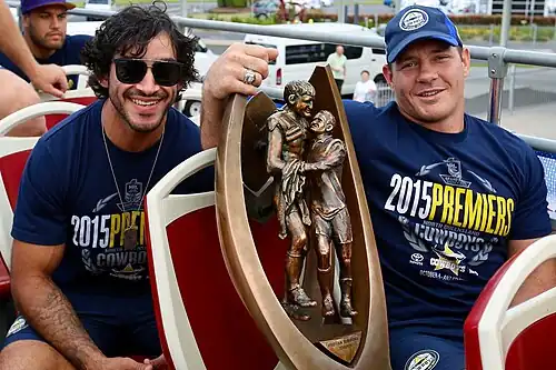 The 2015 North Queensland Cowboys season was the 21st in the club's history. Coached by Paul Green and co-captained by Johnathan Thurston and Matthew Scott, they competed in the NRL's 2015 Telstra Premiership. The Cowboys celebrated 20 years as a club in 2015 and played in the first all-Queensland grand final, defeating the Brisbane Broncos 17–16 in golden point to win their first premiership.