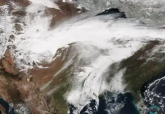 The winter of 2015–16 was quite unusual and historic in terms of winter weather. First, around the end of November near Black Friday, a crippling ice storm hit the Southern and Central Plains with as much as 1.5 inches (38 mm) of ice accumulation in some areas, knocking out power to over 100,000 residents.[5] In December, two winter storms impacted the Great Lakes, with the latter one being a bit farther to the west, both brought roughly a foot of snow in some locations. Normally, in this area, this is not common, but the strong El Niño may have been a contributor to this. Following that, the nation had one of the warmest Decembers on record, with New York City being as warm as 72 °F (22 °C) on Christmas Eve (December 24).[6] This was the warmest temperature in New York City in the second half of December on record.[7] The low that day of 63 °F (17 °C) was the warmest December low on record in New York.[8] In fact, across the Lower 48, this was the warmest and wettest December on record at the time. Every single state in the Northeastern United States saw a record warm December.[9] In 2021, an even warmer December was recorded across the Lower 48, with a mean temperature of 39.3 °F (4.1 °C) rather than 38.6 °F (3.7 °C).[10] This meant Buffalo, New York until December 18, a record for latest first snow.[11] A strong tornado outbreak also occurred from December 23–25, which a very similar event had occurred the year before, just weaker.[12] After this system passed, a larger storm complex moved through the same areas impacted by the ice storm from Black Friday 2015. This storm brought blizzard conditions to parts of Texas and New Mexico, with areas reaching up to close to 2 feet of snow in parts of Texas, which is a rare event in that state.[13] For comparison, the last time this has occurred (or near the same areas), was in 2011 during the Groundhog Day blizzard.
