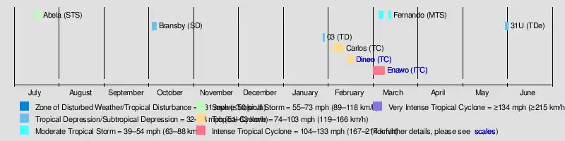 Despite a weak season, the first named tropical cyclone, Abela formed early on July 15. A subtropical depression formed after three months. There were no tropical cyclones in the basin in November, December or January.