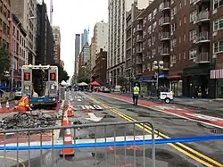 In the Chelsea neighborhood of Manhattan in New York City, on the same day as the Seaside Park bombing, a pressure cooker bomb filled with shrapnel, in the form of small bearings or metal BBs,[6] exploded in a crowded area on West 23rd Street, between Avenue of the Americas and Seventh Avenue at 8:31 p.m.[1][6][7] The explosion occurred in front of 133 West 23rd Street[8] in the vicinity of a construction site,[9] at which materials were in place for exterior renovations of the Visions at Selis Manor facility, an apartment building for the blind, at 135 West 23rd Street.[10][11] Other nearby buildings included the Townhouse Inn of Chelsea,[11] and many restaurants. The Chelsea neighborhood is primarily residential, and has an active nightlife scene.[12]