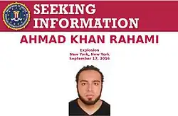- ^ a b "New York bombing suspect named as Ahmad Khan Rahami". BBC News. September 19, 2016. Archived from the original on September 19, 2016. Retrieved September 19, 2016.