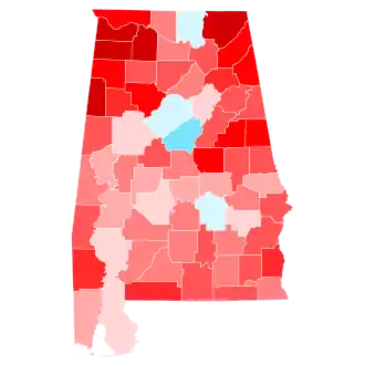 Alabama has voted for the Republican candidate in every election since it was won by Ronald Reagan in 1980. As such, Trump was heavily favored to win the state. On the day of the election, Trump won the election in Alabama with 62.08% of the vote, while Clinton received 34.36% of the vote.[3] The state had given 60.55% of its votes to Republican nominee Mitt Romney in 2012, meaning that it had shifted 1.53% more Republican from the previous election. Trump's margin of victory in Alabama was 27.72%, a 5.53% increase from Romney's 22.19% margin of victory. Alabama did not swing particularly hard to the right, as its white voters without college degrees were already extremely Republican.[4]