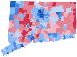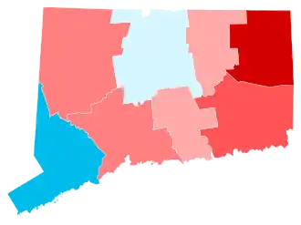 Trump's strongest county in the state was rural Litchfield County, while Clinton's biggest win was in adjacent, more urban Hartford County.[3] Areas that swung in Clinton's favor were mainly concentrated in suburban Fairfield County, in towns like Greenwich, Darien, New Canaan, and Westport.[4][3] This area is home to many New York City commuters. Other Democratic swings happened in suburbs outside Hartford, such as Avon, Granby, East Granby, and Glastonbury, as well as outside New Haven, in towns like Guilford, Madison, and Woodbridge.[4][3] This was the first time since 1888 that Darien and the first time since 1912 that Easton voted Democratic, largely due to opposition to the populist Trump among historically Republican affluent and educated voters. By contrast, areas that swung hard for Trump were mainly located in Windham County and northern New London County, in towns like Killingly, Sterling, Plainfield, and Voluntown.[5] This mirrored a national trend of Trump gaining White working-class support.