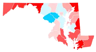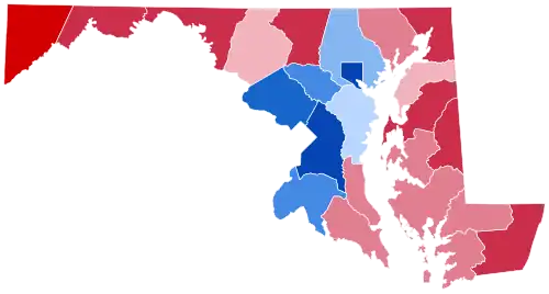 Clinton won Maryland with 60.3% of the vote, while Trump received 33.9%.[3] Maryland was among the eleven states (and the District of Columbia) in which Clinton improved on Barack Obama's 2012 raw vote total, although by just 84 votes.[4] Maryland was one of four states in which Clinton received over 60% of the vote, the others being Massachusetts, Hawaii, and California. However, Maryland was the only one of those eleven states to have voted more Democratic in both 2012 and 2016. In this election, Maryland voted 24.32% to the left of the nation at-large.[5]