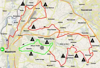 The race started on Maastricht's Markt, the city's central market square, and finished in Berg en Terblijt, covering 121.6 km. The route was made up of one bigger loop in the south of Limburg, followed by three 17.6 km loops centering around Valkenburg which featured the Geulhemmerberg, Bemelerberg and Cauberg climbs. In total, the route contained 17 categorized hills, usually short but with a varying gradient and coming in quick succession throughout the race.[1] The Cauberg was addressed four times; its last crossing was also the last climb of the day. From the top of the Cauberg, there was a 1.7 km run-in to the finish line in Berg en Terblijt.[4]