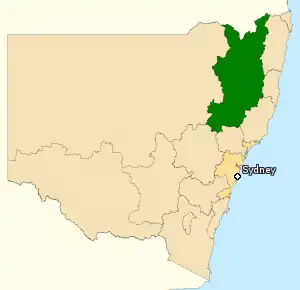 ![]() The Division of New England covers 66,394 km² in northern rural New South Wales. From south to north it includes the regional population centres of Scone, Tamworth, Armidale, Glen Innes, Inverell and Tenterfield. | ||||||||||||||||||||||||||||