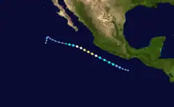 On July 28, the NHC noted the possibility of an area of low pressure well south of Mexico developing over subsequent days.[89] An area of disorganized showers and thunderstorms associated with a tropical wave materialized three days later, but little change occurred thereafter.[90] Early on August 3, a surface circulation formed in association with concentrating convection,[91] and this process led to the formation of a tropical depression by 06:00 UTC the next day.[92] The newly formed cyclone did not intensify after designation, and its low- and mid-level circulations separated by over 265 mi (425 km) on August 5 due strong easterly wind shear.[93] Falling short of the tropical storm criteria, the short-lived depression was declared a remnant low at 18:00 UTC that day.[92] The lingering vortex slowed its northwestward motion and executed a counter-clockwise loop, before dissipating completely 205 miles (330 km) southwest of the Baja California Peninsula on August 8.[92]