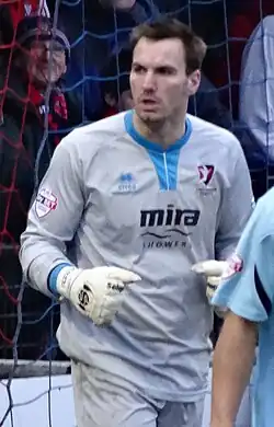 On 8 December, Vale seemed to be heading for 2–0 defeat at Morecambe with a poor performance when, on 83 minutes, Antony Kay successfully evaded the home side's offside trap on a free kick to pull a goal back, and then Pope scored an equalizing goal four minutes later; Brown then immediately gave away a penalty, which was missed by former Vale striker A-Jay Leitch-Smith to leave the final score at 2–2.[44] Struggling Cheltenham Town came to Burslem the following week amidst awful weather conditions, and just 3,109 spectators witnessed a 2–2 draw, Kay secured a point with a stoppage-time header.[45] No goals were scored in the trip to the league's bottom club Macclesfield Town – a club that had rediscovered their National League winning form under new manager Sol Campbell; the clean sheet and a third consecutive draw were earned largely thanks to some impressive first-half saves from Brown.[46] Grimsby Town were the visitors at Vale Park on Boxing day and they came away with a 1–0 win; Wes Thomas scored the only goal of the game on 62 minutes.[47] Oldham arrived in Burslem three days later, having sacked manager Frankie Bunn following a 6–0 defeat; Vale crashed to a 4–1 defeat to the managerless "Latics" to put intense pressure on Aspin.[48]