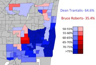 Trantalis placed first in the primary election with 46 percent of the vote, but did not receive a majority, so he proceeded to a runoff election with Roberts, who received 31 percent. In the runoff election, Trantalis defeated Roberts by a wide margin, winning 65 percent of the vote, becoming the city's first openly gay mayor.[2]