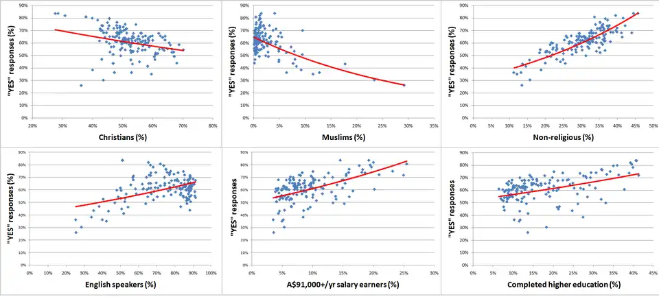 290. ^ Livsey, Anna; Ball, Andy (17 November 2017). "Same-sex marriage survey: religious belief matched no vote most closely". The Guardian. Archived from the original on 15 August 2024. Retrieved 19 November 2017.