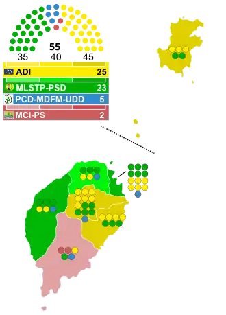 The final result was 25 seats to the ADI, 23 to the MLSTP-PSD, 5 to the PCD/MDFM-UDD coalition and 2 to the MCISTP, both in the Caué constituency.