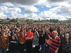 The National School Walkout[44] occurred nationally on April 20, 2018, which was the 19th anniversary of the Columbine High School massacre.[45] The movement was founded and organized by Lane Murdock of Ridgefield High School.[46][47][48] On the day of the walkout, student demonstrators wore safety orange and departed from over 2600 schools to push for legislative action against gun violence.[49]
