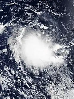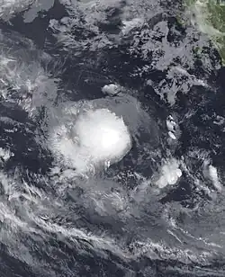 At around 23:00 UTC on 22 February, the BOM reported that a tropical low had developed within a low-pressure trough over the far-eastern Indian Ocean.[75] Located approximately 285 km (177 mi) south-southwest of Indonesia's Sumba island, the system remained slow-moving initially, before adopting a track towards the southwest on 23 February.[76][77] The tropical low developed rapidly in a favourable environment for intensification characterised by abundant atmospheric moisture, sea surface temperatures in excess of 30 °C (86 °F), low vertical wind shear and strong outflow in the upper troposphere.[77][78] The tropical low's convective structure improved considerably during the night, and the JTWC upgraded the system to a tropical storm on the Saffir–Simpson hurricane wind scale (SSHWS) at 18:00 UTC.[78] The BOM followed suit at 00:00 UTC on 24 February, officially upgrading the system to a Category 1 tropical cyclone on the Australian scale and assigning the name Ferdinand.[79]