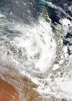 A tropical low was reported to have formed by the BOM in the Gulf of Carpentaria on 21 February.[69] The tropical low quickly organized over the pursuing days, showing significant bursts of convection to the north of its centre. The low was eventually upgraded into a Category 1 tropical cyclone, being given the name Esther on 23 February. Moving quickly south, Esther eventually made its first landfall on Mornington Island around 20:30 UTC, where a peak 988 mb pressure reading was recorded.[70] Esther retained its intensity despite the land interaction, and make its second and final landfall near the Northern Territory–Queensland border 6 hours later at 2:00 UTC, 24 February.[71] Weakening below tropical storm intensity quickly after landfall. Esther was declared to have become an Ex-Tropical Cyclone about 2 hours later. Continuing to move further inland under the influence of a subtropical ridge, Esther's remnants shifted in a more westerly direction. Esther's convection and structure however stayed consistent far inland and led to the JTWC noting a low possibility of regeneration as it moved west towards the Eastern Indian Ocean.[72] Over the proceeding days, Esther's remnant low was given a medium chance of re-development over land. As a result of the brown ocean effect, Esther's convection steadily re-developed over land on 27 February as it drew moisture from the nearby water. A Tropical Cyclone Formation Alert was then issued for the system's remnants that same day as it was now likely to briefly emerge over the Joseph Bonaparte Gulf. However, by the next day, Esther was deemed not likely to emerge overseas contrary to forecast and the TCFA was cancelled while its convection weakened yet again. On 29 February, the TCFA was re-issued as Esther's center skirted the northeastern Kimberley coast. On 1 March, the TCFA was once again cancelled as the system began moving further inland. As it did so, convection decreased rapidly. The remnants persisted for 4 days, before finally dissipating in the Australian desert.