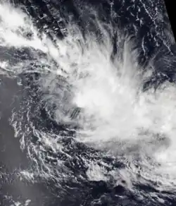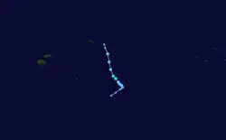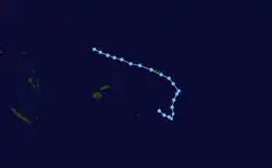 During January 24, the FMS reported that Tropical Disturbance 05F had developed about 75 km (45 mi) to the northwest of Pago-Pago in American Samoa.[88][89] At this time, the disturbance was poorly organised with atmospheric convection located to the north of its low-level circulation center.[88] During that day, the disturbance moved south-eastwards within an environment favourable for further development, with low vertical windshear, warm sea surface temperatures, while its outflow was enhanced by strong westerlies.[88][90] As a result, atmospheric convection started to wrap into the system's consolidating low-level circulation center, which prompted the JTWC to issue a tropical cyclone formation alert on the disturbance.[90] During the next day, the JTWC initiated advisories on the disturbance and designated it as Tropical Cyclone 12P, as the system peaked with 1-minute sustained windspeeds of 65 km/h (40 mph).[91][92] The system subsequently moved south-eastwards into an area of moderate vertical wind shear, while atmospheric convection became sheared and located to the northeast of the disturbance's exposed low-level circulation centre.[93][94] As a result, the FMS issued their final warning on the disturbance, as it was expected to move further south into an area of high vertical wind shear.[93] During January 26, the JTWC subsequently issued their final warning on the system after it had dissipated.[95]