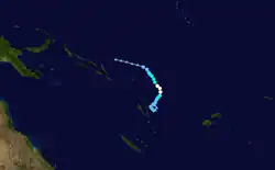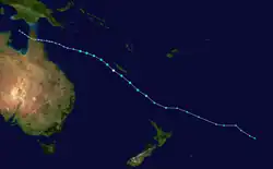 Ahead of the season officially starting on November 1, the Fiji Meteorological Service (FMS) and New Zealand's National Institute of Water and Atmospheric Research (NIWA), both issued a tropical cyclone outlook that discussed the upcoming season.[2][3] These outlooks took into account a variety of factors such as what had happened in previous seasons.[2][3] The Southwest Pacific tropical cyclone outlook issued by New Zealand's National Institute of Water and Atmospheric Research (NIWA) in conjunction with MetService and various other Pacific meteorological services, predicted that nine to twelve tropical cyclones would occur over the South Pacific Ocean between 135°E and 120°W.[3] The outlook also predicted that at least four of these tropical cyclones would intensify further and become either a Category three, four or five severe tropical cyclone on the Australian tropical cyclone intensity scale.[3] In addition to contributing towards the Southwest Pacific tropical cyclone outlook, the FMS predicted that between five and eight tropical cyclones would occur within the basin, while two to four of these tropical cyclones were expected to intensify further and become either a category three, four or five severe tropical cyclone on the Australian scale.[2]