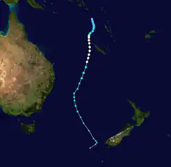 During March 15, Tropical Cyclone Gretel moved into the basin from the Australian region, about 620 km (385 mi) to the northwest of Nouméa in New Caledonia. [192] Gretel continued to organise upon its entrance into the basin, exhibiting well-developed rainbands within a low-shear environment.[193][194] Forced southeast by a nearby subtropical ridge,[195] The storm passed 150 km (93 mi) south of New Caledonia on March 15.[196] During this time, an eye-feature was noted by the JTWC on microwave-wavelength satellite imagery.[197] The FMS upgraded Gretel to a Category 2 cyclone at 12:00 UTC that day.[198] However, the storm's convective activity soon began to diminish as dry air began to permeate the low-level circulation center.[199][200] The addition of strong vertical wind shear caused Gretel's remaining showers and thunderstorms to dislocate from the central vortex.[201] Gretel quickly developed frontal features on March 16—a sign of extratropical transition.[202]