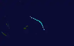 Due to an area of high pressure to its east, Sarai took a southerly course during its early stages as a named system.[43] The high pressure region would later shift its orientation, causing Sarai to gradually curve towards the east.[44] On December 27, the cyclone's winds increased further past Category 2 cyclone thresholds, with one-minute sustained winds to hurricane-force.[45] The following day, the FMS assessed a peak intensity with ten-minute sustained winds of 110 km/h (68 mph).[46] At the time, a large eye was evident on microwave satellite data while the storm tracked towards the southeast along the periphery of the jet stream, and remained present throughout the day.[47][48][49] Sarai reached its lowest barometric pressure on December 29 before weakening due to increasing wind shear of 55–65 km/h (34–40 mph), resulting in a loss of organisation.[50][51][52] Sarai's center of circulation became displaced from the storm's convection on December 30, and the storm weakened to Category 1 strength.[53] Its center tracked near Nukuʻalofa on December 31 while the storm's structure rapidly deteriorated, with the JTWC issuing their final advisory that day.[54] The FMS continued monitoring the system as an ex-cyclone as the storm accelerated eastward, highlighting a low possibility for regeneration;[55] the agency ultimately issued their final bulletin on the system on January 2.[56]