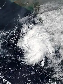 On September 28, a low pressure area formed on the adjoining areas of Saurashtra and Kutch in the state of Gujarat. The low pressure area later concentrated into a depression and moved close to Kandla at 12:00 UTC, next day. It moved east-northeastwards, towards eastern Rajasthan maintained its intensity and it developed a ragged eye until on October 1, it weakened into a low pressure area.[34]
