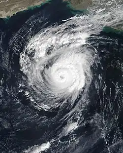 A well-marked low-pressure area near the southwestern part of Sri Lanka strengthened into a depression on October 30.[36] The depression would keep intensifying as it entered a more favorable environment, resulting in it upgraded into Cyclonic Storm Maha on November 1. Maha continued to intensify, fluctuating in intensity for the next 2 days as it moved along the Indian coast, before becoming a very severe cyclonic storm on November 3. Maha would reach its peak intensity, strengthening into an extremely severe cyclonic storm the next day, before beginning to stall in the Arabian Sea due to a lack of steering currents. Upwelling would begin to take its toll on the storm, resulting in Maha weakening into a cyclonic storm as it approached Gujarat. It would later make landfall near Gujarat as a tropical depression and quickly weakened afterwards.