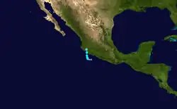 The tropical wave that spawned Cosme was succeeded a week later by another. It entered the East Pacific on July 8 but remained disorganized for several days while tracking west. The wave gave way to an area of low pressure on July 12, which then organized into a tropical depression only six hours later. The depression was located over very warm sea surface temperatures but under the influence of moderate wind shear, preventing organization. By July 12, persistent upper-level winds began to shear away the cyclone's convection. It degenerated to a remnant low at 00:00 UTC on July 14 while located south-southwest of Baja California Sur. The low produced intermittent bursts of convection as it moved west-northwest but ultimately dissipated early on July 15.[17]