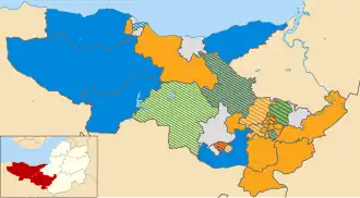 ![]() Map showing the results of the 2019 Somerset West and Taunton Council elections. Blue showing Conservative, Red showing Labour, Yellow showing Liberal Democrats, Green showing Greens and Grey showing Independents. Striped wards have mixed representation. | |||||||||||||||||||||||||||||||||||||||||||||