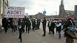 The 2020–2021 women's strike protests in Poland, commonly called the Women's Strike (Polish: Strajk Kobiet), were anti-government demonstrations and protests in Poland that began on 22 October 2020, in reaction to a ruling of the Constitutional Tribunal, mainly consisting of judges who were appointed by the ruling Law and Justice (Polish: Prawo i Sprawiedliwość, PiS) dominated United Right, which tightened the law on abortion in Poland. The ruling made almost all cases of abortion illegal, including those cases in which the foetus had a severe and permanent disability, or an incurable and life-threatening disease.[37][38] All-Poland Women's Strike was charged by the authorities for having illegally organised the protests.[39]