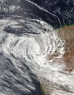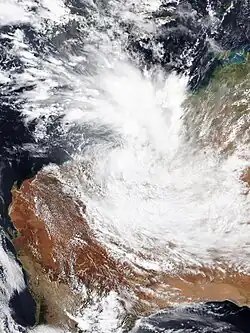 Tropical Low 02U made landfall between Port Hedland and Whim Creek on the Pilbara coastline just after 03:00 UTC on 11 December.[39] About three hours prior to landfall, the JTWC reported that maximum one-minute sustained winds had increased to 75 km/h (45 mph).[37] Sustained gale-force winds were observed at Bedout Island and Port Hedland around the time of landfall, peaking at 70 km/h (45 mph) at both locations.[40][41] Ten-minute sustained winds also reached 63 km/h (39 mph) on Legendre Island at 00:00 UTC.[42] Despite these wind readings, the BOM did not classify the low as a Category 1 tropical cyclone because they determined that gale-force winds did not extend more than halfway around the centre. They attributed the strong winds on the eastern side of the system to a combination of enhanced northwesterly monsoonal flow and the system's fast translational velocity, rather than the low having intensified into a tropical cyclone.[43] The tropical low continued rapidly inland across Western Australia over the next day, accelerating to about 50 km/h (30 mph) soon after landfall.[44][45] Despite tracking over land, the BOM indicated that sustained winds to gale force, accompanied by gusts of up to 100 km/h (60 mph), could still occur near the centre of the system, particularly on the eastern side.[46] The weakening tropical low was last mentioned by the BOM at around 08:00 UTC on 12 December, while located in the southeastern corner of Western Australia.[44][47]