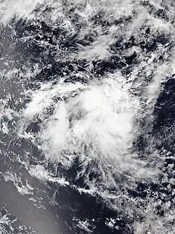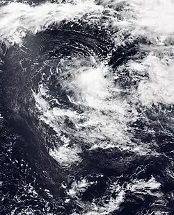 On 5 January, the Bureau of Meteorology (BOM) reported that a weak tropical low had formed within a trough over the eastern Indian Ocean, centred approximately 500 km (310 mi) northeast of the Cocos Islands.[115][116] Environmental conditions were assessed by the BOM as being unfavourable for significant intensification of the low, citing in particular the strong easterly winds in the upper troposphere that were forecast to develop by 10 January.[117] The tropical low meandered gradually southwards over the following days,[118] passing well to the east of the Cocos Islands on 8–9 January, around which time the system began to accelerate towards the west-southwest.[117][119] On 9 January, the Joint Typhoon Warning Center (JTWC) reported the development of formative convective rainbands wrapping into the tropical low's centre, and determined that environmental conditions were favourable for the system to strengthen, in contrast with the BOM's assessment. The JTWC noted the presence of strong poleward upper-level outflow, low vertical wind shear values and warm sea surface temperatures of 29–30 °C (84–86 °F).[120] By 05:00 UTC on 10 January, gale-force winds had developed in the southern quadrants of the tropical low, in part due to the fast translational velocity of the system towards the west-southwest.[119] The system's minimum atmospheric pressure was estimated at 1002 hPa (29.59 inHg) at that time.[121] Then, the system exited the basin towards the Southwest Indian Ocean on 10 January, before dissipating immediately thereafter, due to unfavourable high wind shear.