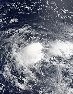On 6 December, the Bureau of Meteorology (BOM) reported that a tropical low had developed within a monsoon trough near the western end of Java, approximately 200 km (120 mi) north-northeast of Christmas Island.[26][27] The system was assigned the official identifier code 02U upon formation.[26] Initially located in an unfavourable environment for intensification, the tropical low began to encounter somewhat improved conditions as it tracked towards the southeast.[28][29] On 7 December, warm sea surface temperatures and strong diffluence in the upper troposphere fuelled the development of deep convection around the system's low-level circulation centre. Referencing the tropical low's quickly improving structure and the presence of a weak eye feature in microwave satellite imagery, the Joint Typhoon Warning Center (JTWC) issued a Tropical Cyclone Formation Alert for the system at 05:30 UTC.[28] After tracking in a clockwise path around the northeastern side of Christmas Island, Tropical Low 02U became quasi-stationary on 8 December.[30][31] Deep convection continued to develop near the centre during the overnight period, and as the low began to track eastwards, the JTWC upgraded the system to a tropical storm on the Saffir–Simpson hurricane wind scale at 18:00 UTC on 8 December.[32]