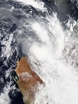 Tropical Low 02U soon assumed a southeastward course, steered by the influence of a subtropical ridge situated to the east. Environmental conditions remained only marginally favourable for development, however, and the system's deep convection became displaced to the southwest of the centre due to northeasterly vertical wind shear, leaving the low-level circulation centre fully exposed.[33] During this period, the JTWC reported that the tropical low's one-minute sustained winds had decreased to approximately 65 km/h (40 mph), from the earlier peak of 85 km/h (55 mph).[32][33] By 12:00 UTC on 10 December, the system had begun to accelerate towards the southeast, moving into an environment more favourable for intensification.[34][35] The interaction with an upper-level trough enhanced the tropical low's poleward outflow channel, allowing deep convection to rebuild over the centre of the system.[35][36] This enabled the system to strengthen as it rapidly approached the coast of Western Australia at a speed of approximately 40 km/h (25 mph), although vertical wind shear once again began to increase.[37][38]